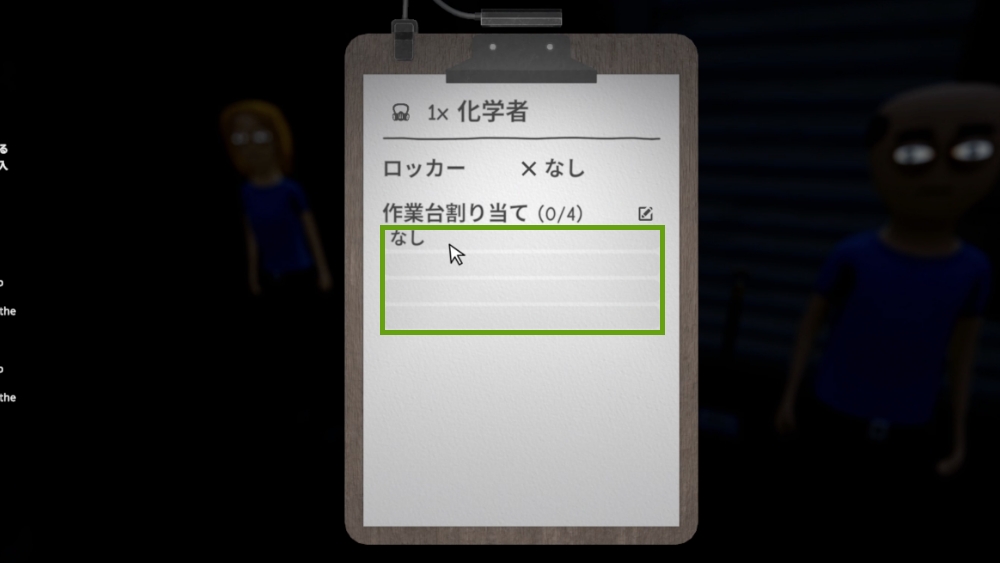 化学者のクリップボードでは、作業員にどのロッカーを使わせるか、どの作業台を担当させるかを設定できます。