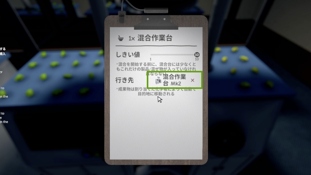 「行き先」では、製造した製品をどこへ運ぶかを設定できます。設定された行き先には、化学者が自動で製品を運んでくれます。基本的には、梱包作業台や次の混合作業台を設定します。設定すると、混合作業台で混合作業を行った後に設定した場所へ化学者が自動で移動させます。