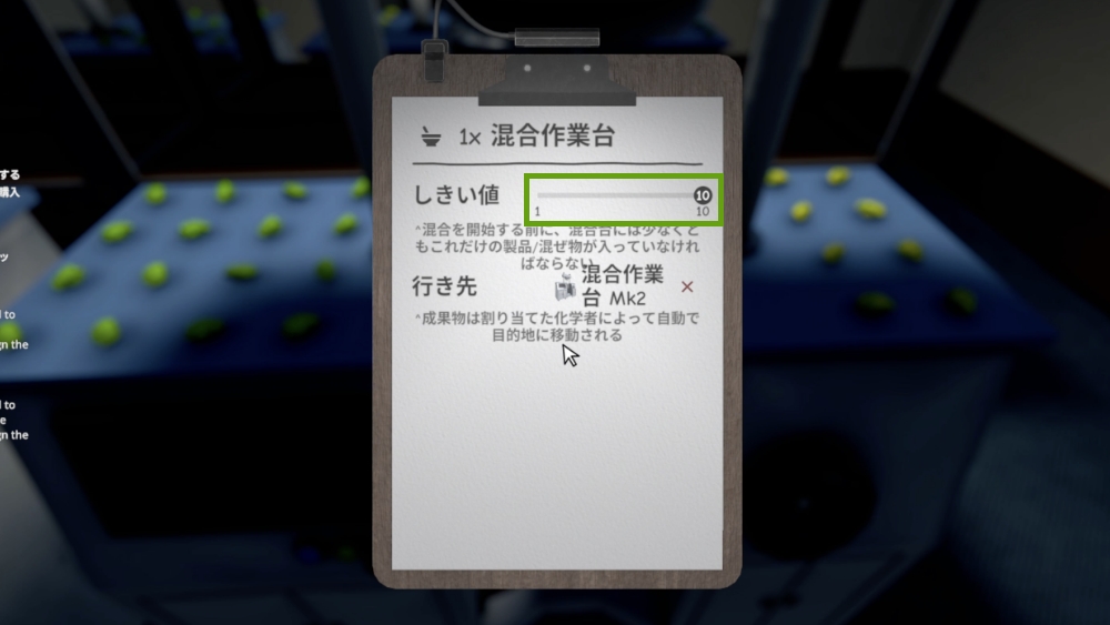 「行き先」では、製造した製品をどこへ運ぶかを設定できます。設定された行き先には、化学者が自動で製品を運んでくれます。例えばメスを製造し、行き先を実験用オーブンにした場合。実験作業台で液体メスを製造し、その後に実験用オーブンに化学者が自動で移動させます。