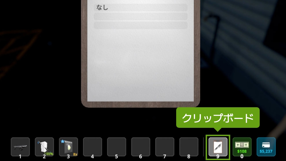 従業員を雇うと、自動的にアイテム欄に「クリップボード」が追加されます。このクリップボードは、キーボードの 9キー を押すことでも呼び出すことができます。