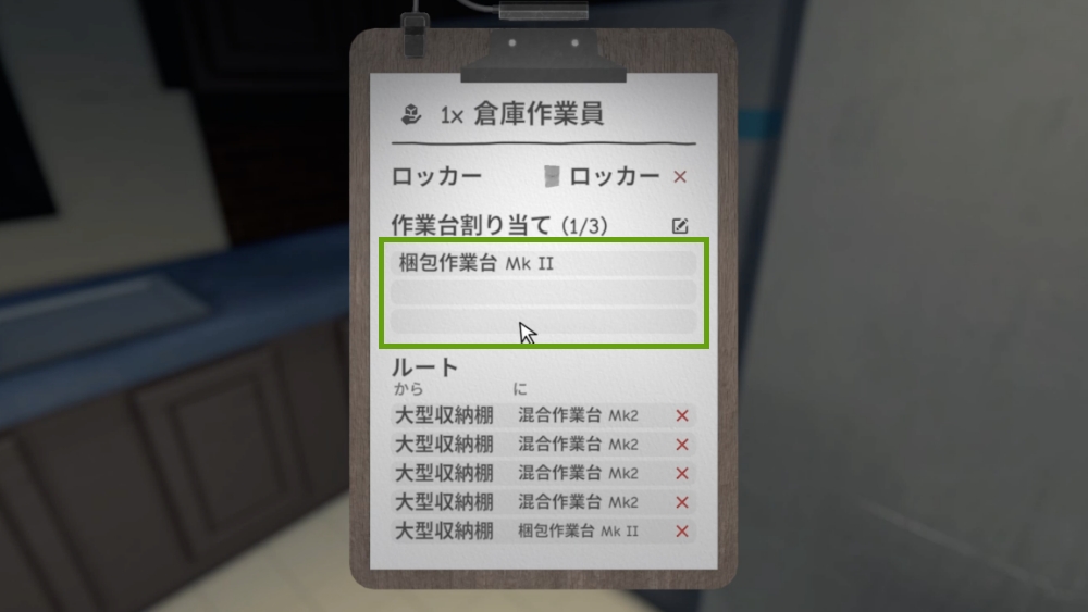 倉庫作業員のクリップボードでは、作業員にどのロッカーを使わせるか、どの作業台を担当させるかを設定できます。