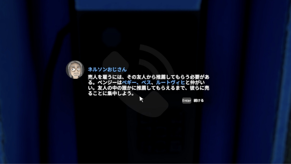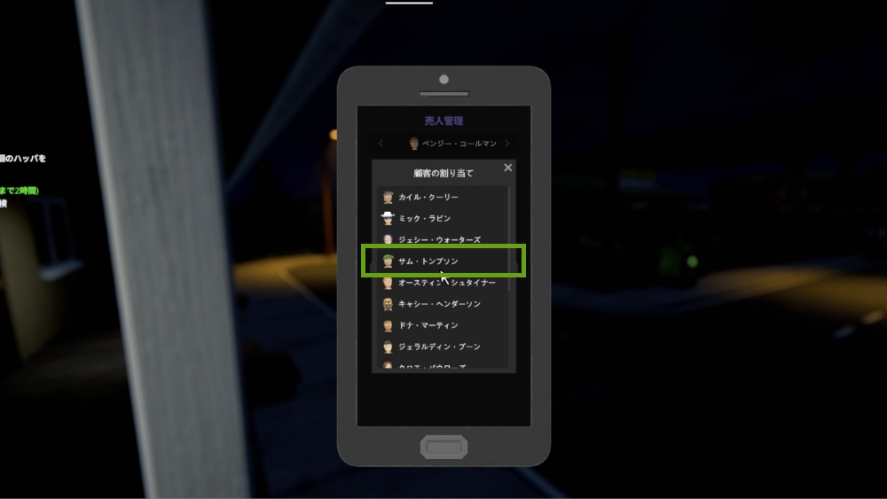 事業拠点と顧客基盤が整ってくると、プレイヤー一人で顧客を管理するのは難しくなります。そこでネルソンおじさんから、販売を代行する売人を雇う必要があると助言されます。