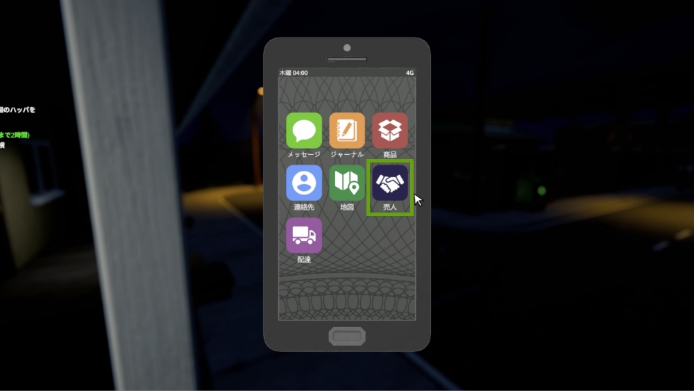 携帯を開き、売人アプリを起動します。このアプリでは、売人が所持している商品数や売上(現金)、取り分(カット)を確認できます。現時点では売人の取り分は一律で20%です。