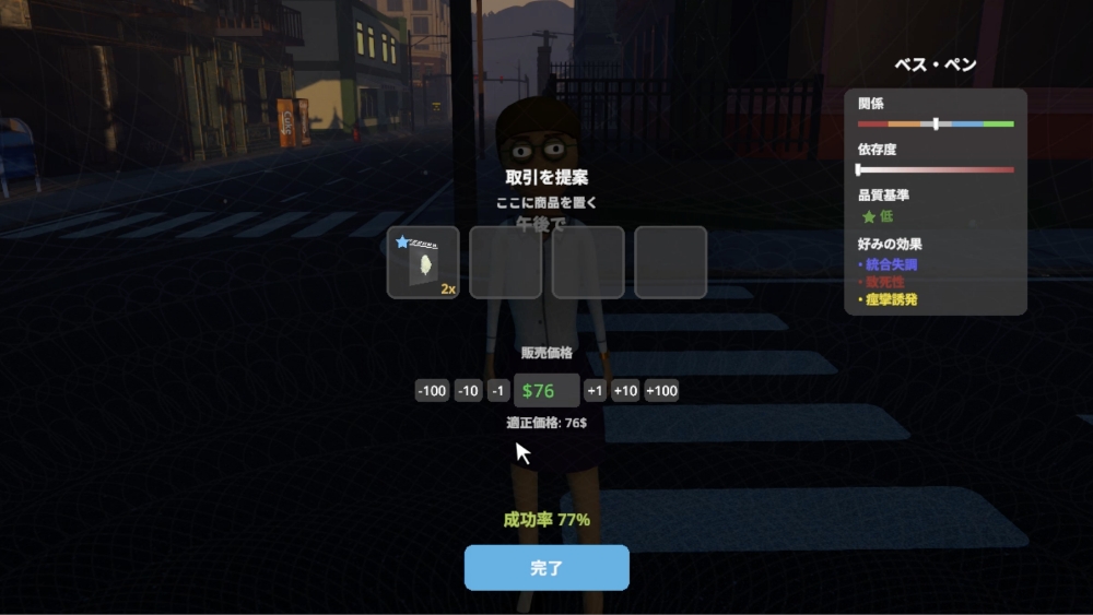 3人のうち誰か一人でも友好的な関係になると、その顧客が関係を持つ売人を紹介してくれます。今回はベス・ペンが友好的になったことで、ベンジー・コールマンを紹介してくれました。