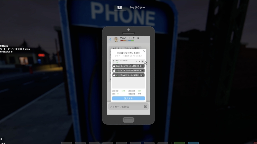 公衆電話でネルソンおじさんに連絡し、欠けている重要な材料「ハッパの種」の入手方法を教えてもらいます。 おじさんはすでに供給者 アルバート・フーバー にプレイヤーの番号を伝えており、 メッセージを送るだけで注文が可能です。支払いはつけ払いで問題ありません。
