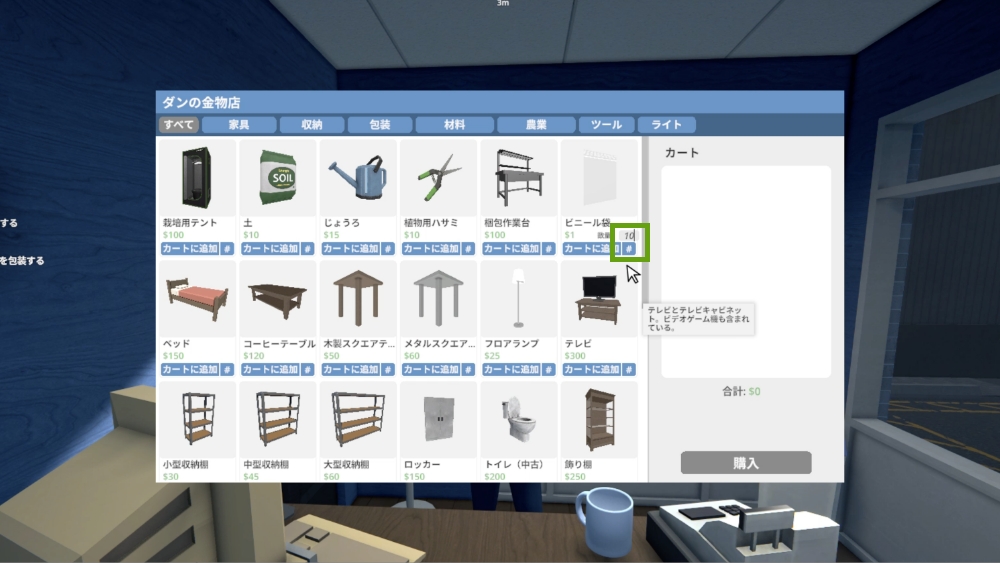 金物店で栽培に必要な装備を整え、モーテルの部屋で栽培環境を準備しましょう。 金物店に行く前に1号室へアイテムを置いておくと購入がスムーズです。
